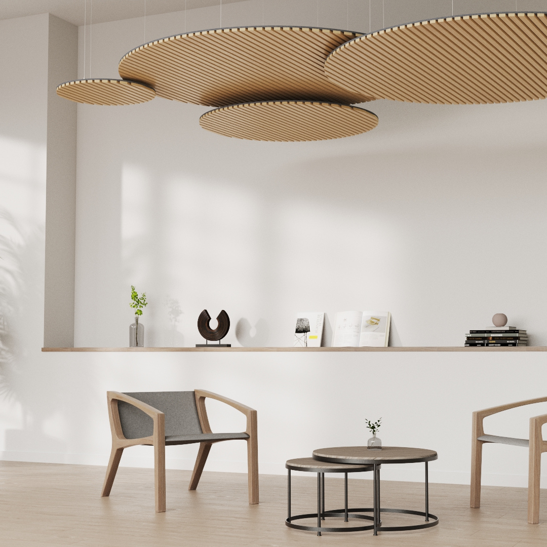 Elementos acústicos suspendidos en el cielo que absorben el sonido desde múltiples ángulos. Una solución ideal para oficinas, salas de reuniones o espacios con techos altos donde es necesario controlar la reverberación.